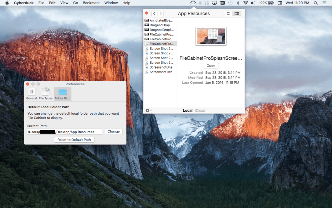 In response to customer feedback, we have now added a feature that allows you to change the default local directory File Cabinet Pro displays to any local folder of your choosing. Simply open the Settings window and select the “Folder Path” toolbar item. From there, you can change the local directory File Cabinet Pro displays.